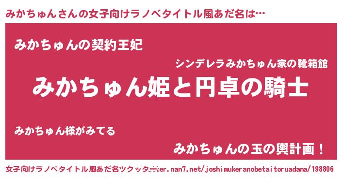 みかちゅんさんの女子向けラノベタイトル風あだ名は… 『みかちゅん姫と円卓の騎士』『みかちゅんの契約王妃』『みかちゅんの玉の輿計画!』 ツクッター #女子向けラノベタイトル風あだ名ツクッター http://tkutter.nan7.net/joshimukeranobetaitoruadana/198806/