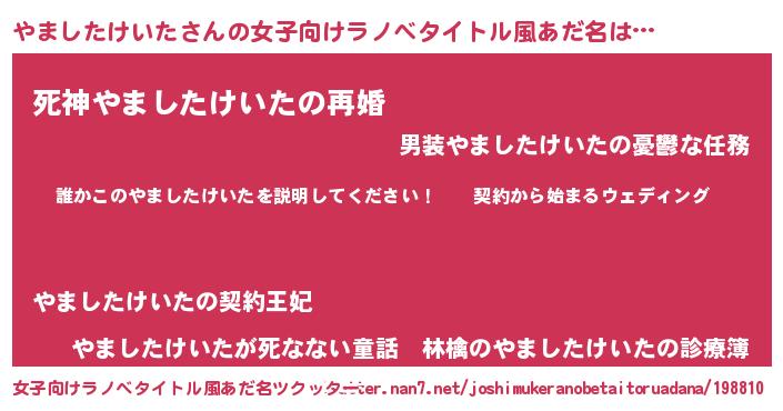 | 男性向けラノベタイトル風あだ名 | 『ヤマシタケイタアートオンライン』 |