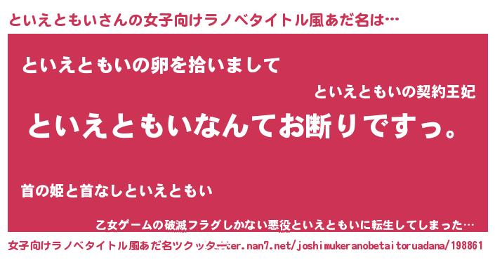 といえともいさんの女子向けラノベタイトル風あだ名は… 『といえともいなんてお断りですっ。』『といえともいの卵を拾いまして』『乙女ゲームの破滅フラグしかない悪役といえともいに転生してしまった…』 ツクッター #女子向けラノベタイトル風あだ名ツクッター http://tkutter.nan7.net/joshimukeranobetaitoruadana/198861/