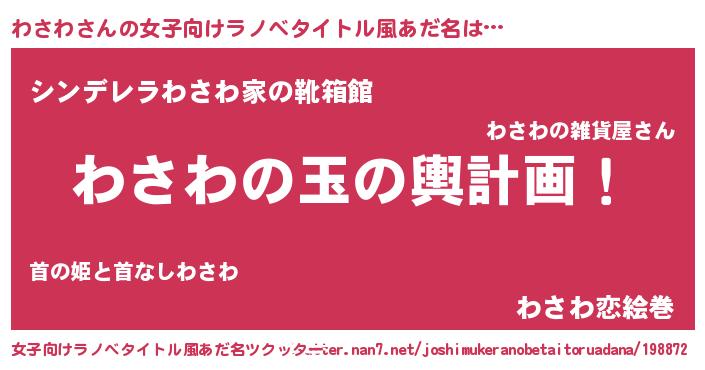| 男性向けラノベタイトル風あだ名 | 『わさわ~年齢イコール彼女いない歴の魔法使い~』 |