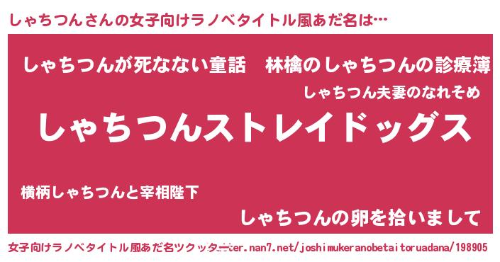 | 男性向けラノベタイトル風あだ名 | 『Re:しゃちつんから始める異世界生活』 |