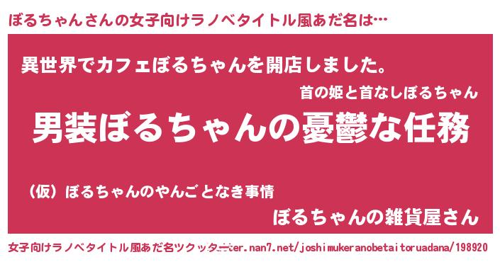 ぼるちゃんさんの女子向けラノベタイトル風あだ名は… 『男装ぼるちゃんの憂鬱な任務』『異世界でカフェぼるちゃんを開店しました。』『ぼるちゃんの雑貨屋さん』 ツクッター #女子向けラノベタイトル風あだ名ツクッター http://tkutter.nan7.net/joshimukeranobetaitoruadana/198920/