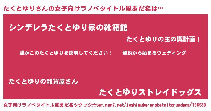 | 意味不明あだ名 | 『ペロリンたくとゆり』『自称たくとゆり』 |