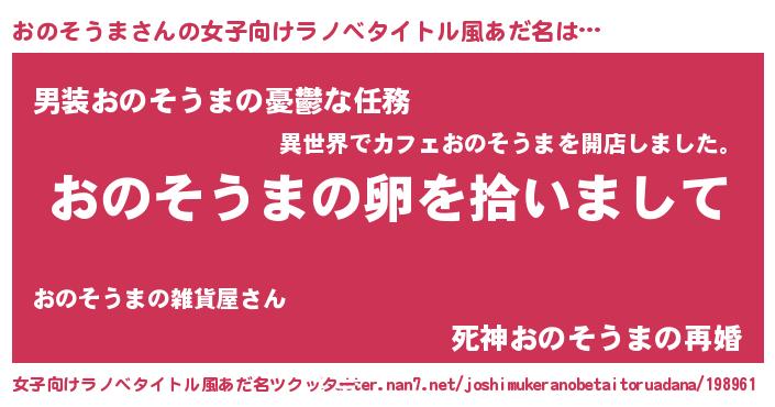 | 男性向けラノベタイトル風あだ名 | 『おのそうまの嫁は女の子じゃないと思った?』 |