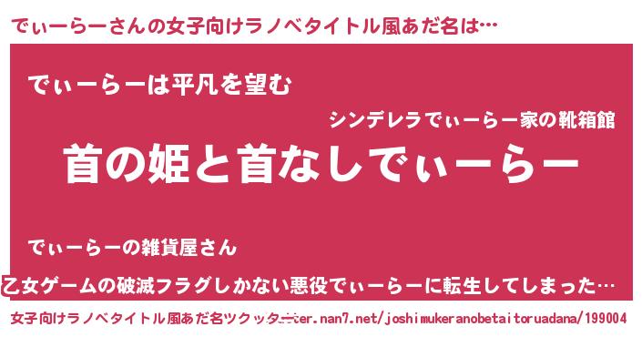 でぃーらーさんの女子向けラノベタイトル風あだ名は… 『首の姫と首なしでぃーらー』『でぃーらーは平凡を望む』『乙女ゲームの破滅フラグしかない悪役でぃーらーに転生してしまった…』 ツクッター #女子向けラノベタイトル風あだ名ツクッター http://tkutter.nan7.net/joshimukeranobetaitoruadana/199004/
