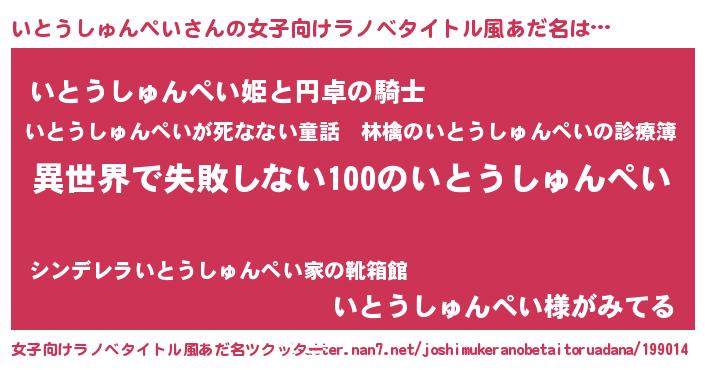 | 男性向けラノベタイトル風あだ名 | 『いとうしゅんぺいという概念が存在しない退屈な世界 』 |