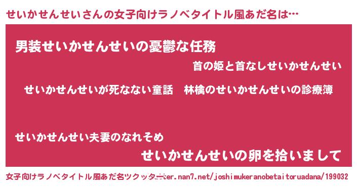 | 胡散臭い通販商品みたいなあだ名 | 『ハリウッド女優が絶賛した100年もののヴィンテージワイン…その名も「せいかせんせい」』 |