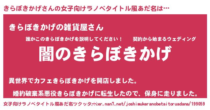 | 男性向けラノベタイトル風あだ名 | 『Re:きらぼきかげから始める異世界生活』 |