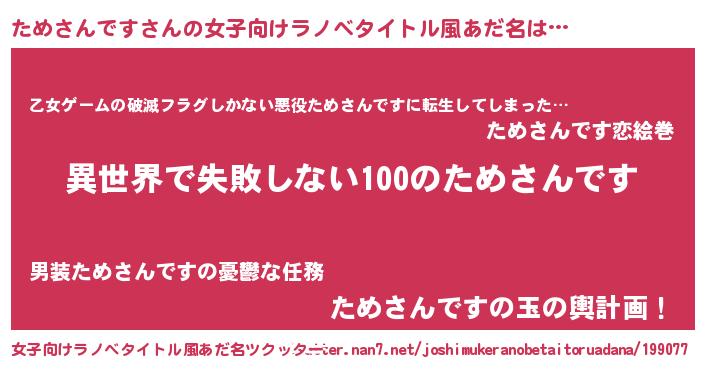 | 男性向けラノベタイトル風あだ名 | 『ためさんですという概念が存在しない退屈な世界 』 |
