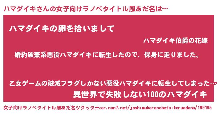 | 男性向けラノベタイトル風あだ名 | 『転生したらハマダイキだった件』 |