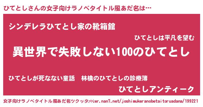 | 男性向けラノベタイトル風あだ名 | 『ひてとしという概念が存在しない退屈な世界 』 |