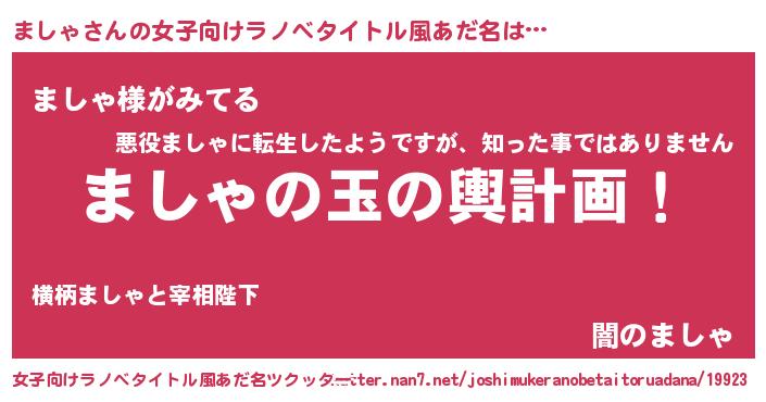 | 男性向けラノベタイトル風あだ名 | 『ましゃ~年齢イコール彼女いない歴の魔法使い~』 |