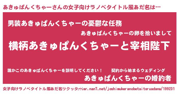 | 男性向けラノベタイトル風あだ名 | 『あきゅぱんくちゃーに滅ぼされるだけの簡単なお仕事です』 |