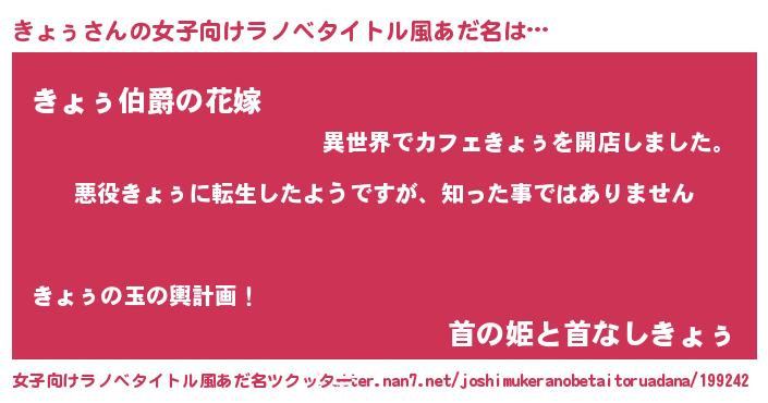 | 男性向けラノベタイトル風あだ名 | 『この素晴らしい世界にきょぅを!』 |
