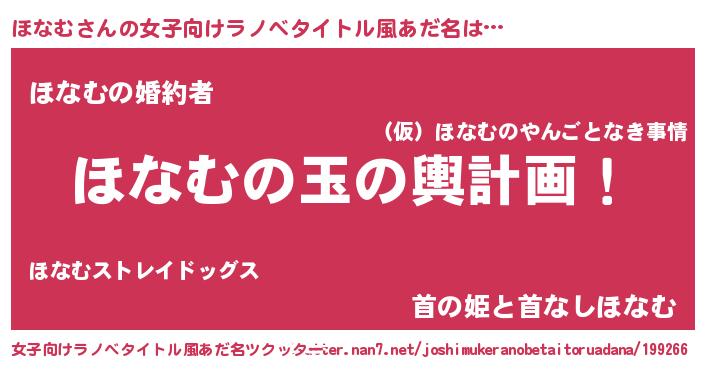 | 男性向けラノベタイトル風あだ名 | 『ほなむ~年齢イコール彼女いない歴の魔法使い~』 |
