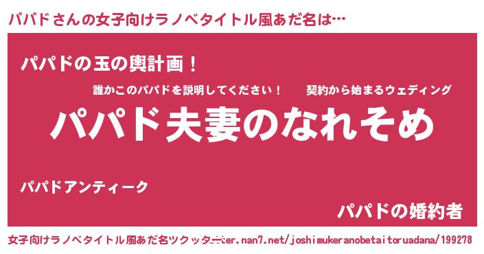 | 男性向けラノベタイトル風あだ名 | 『おまえをオタクにしてやるから、俺をパパドにしてくれ! 』 |