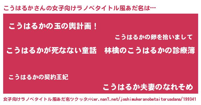こうはるかさんの女子向けラノベタイトル風あだ名は… 『こうはるかが死なない童話 林檎のこうはるかの診療簿』『こうはるかの玉の輿計画!』『こうはるか夫妻のなれそめ』 ツクッター #女子向けラノベタイトル風あだ名ツクッター http://tkutter.nan7.net/joshimukeranobetaitoruadana/199341/