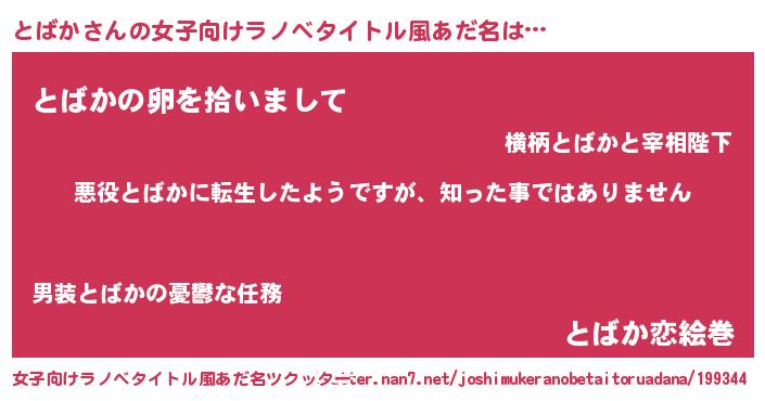 | 男性向けラノベタイトル風あだ名 | 『この素晴らしい世界にとばかを!』 |