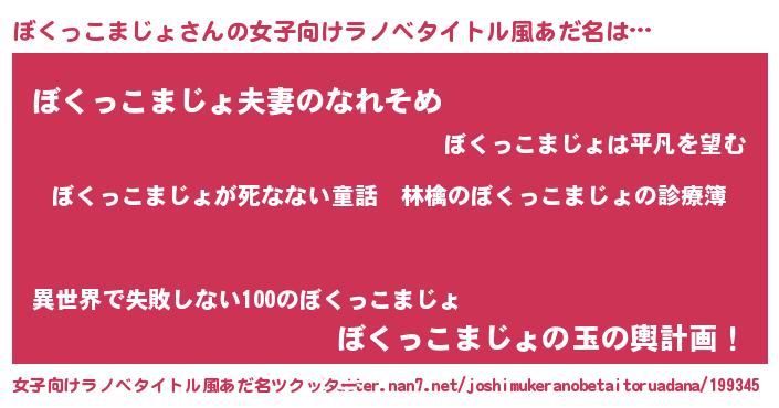 ぼくっこまじょさんの女子向けラノベタイトル風あだ名は… 『ぼくっこまじょが死なない童話 林檎のぼくっこまじょの診療簿』『ぼくっこまじょ夫妻のなれそめ』『ぼくっこまじょの玉の輿計画!』 ツクッター #女子向けラノベタイトル風あだ名ツクッター http://tkutter.nan7.net/joshimukeranobetaitoruadana/199345/