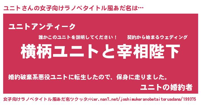 | 男性向けラノベタイトル風あだ名 | 『ユニトに滅ぼされるだけの簡単なお仕事です』 |