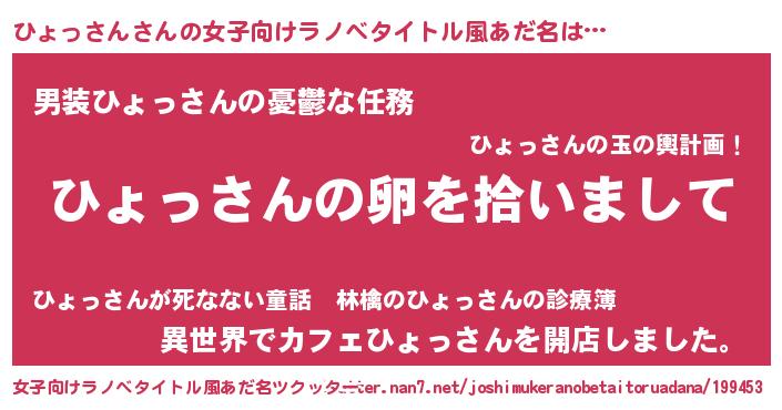 | 男性向けラノベタイトル風あだ名 | 『ダンジョンにひょっさんを求めるのは間違っているだろうか』 |