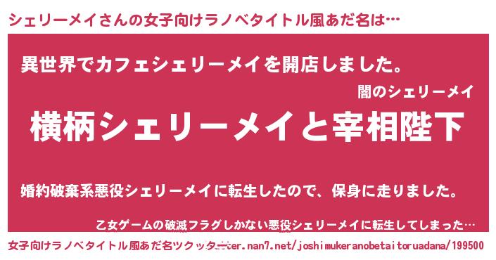 | 男性向けラノベタイトル風あだ名 | 『シェリーメイに滅ぼされるだけの簡単なお仕事です』 |