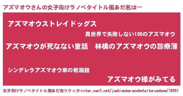 | 男性向けラノベタイトル風あだ名 | 『魔弾の王とアズマオウ』 |