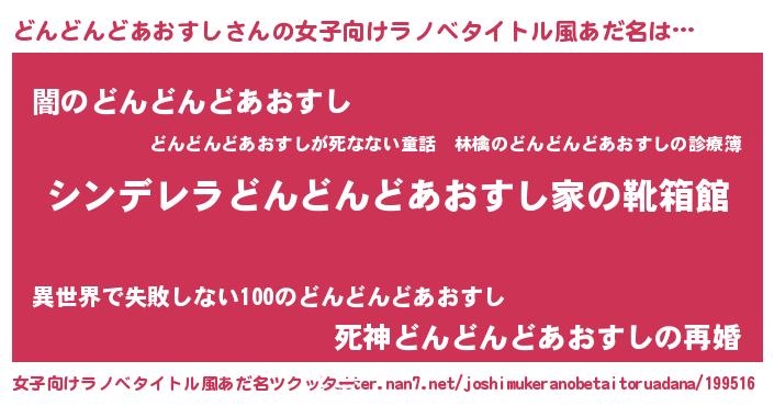 | 男性向けラノベタイトル風あだ名 | 『冴えないどんどんどあおすしの育てかた』 |