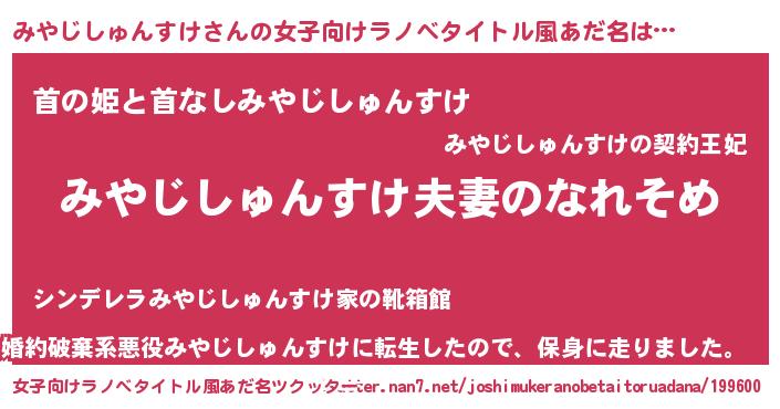 | 男性向けラノベタイトル風あだ名 | 『おまえをオタクにしてやるから、俺をみやじしゅんすけにしてくれ! 』 |