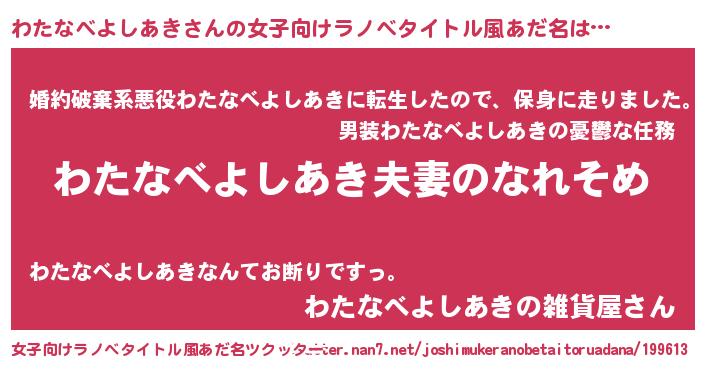 | 男性向けラノベタイトル風あだ名 | 『おまえをオタクにしてやるから、俺をわたなべよしあきにしてくれ! 』 |