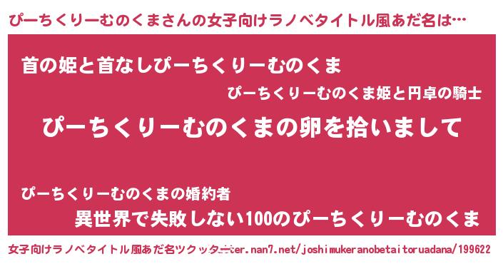 | 男性向けラノベタイトル風あだ名 | 『ダンジョンにぴーちくりーむのくまを求めるのは間違っているだろうか』 |