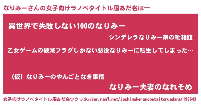 男性向けラノベタイトル風あだ名 | 『魔弾の王となりみー』『なりみーの憂鬱』 |