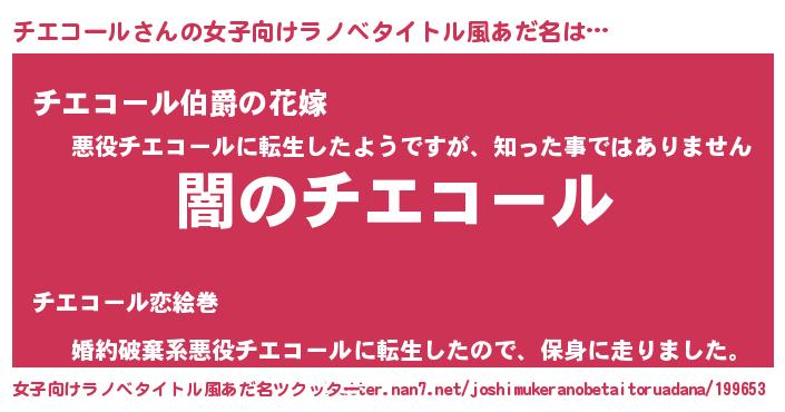 | 男性向けラノベタイトル風あだ名 | 『Re:チエコールから始める異世界生活』 |