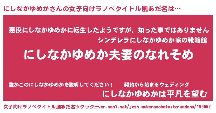 | 男性向けラノベタイトル風あだ名 | 『おまえをオタクにしてやるから、俺をにしなかゆめかにしてくれ! 』 |