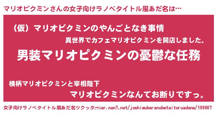 | 男性向けラノベタイトル風あだ名 | 『冴えないマリオピクミンの育てかた』 |