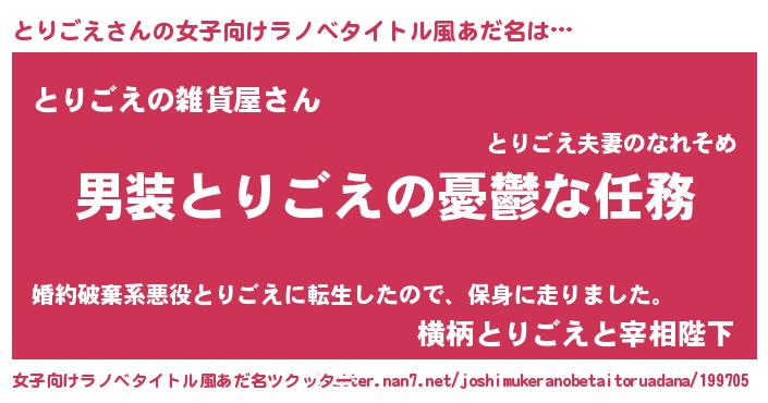| 男性向けラノベタイトル風あだ名 | 『うちのとりごえが世界を掌握している!』 |