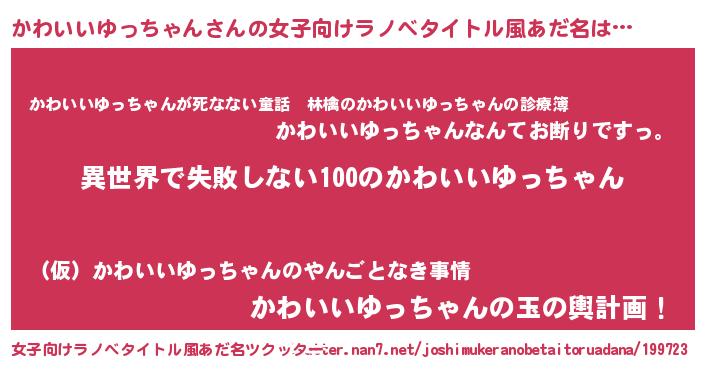 | 男性向けラノベタイトル風あだ名 | 『かわいいゆっちゃんという概念が存在しない退屈な世界 』 |