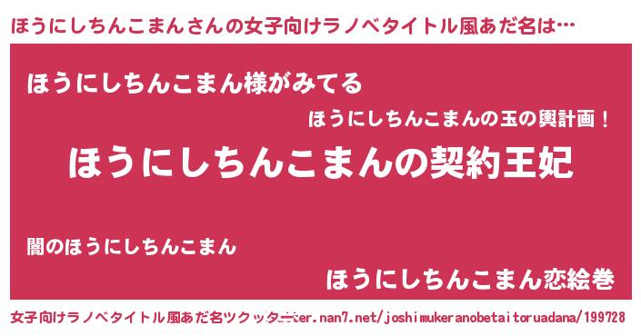 | 男性向けラノベタイトル風あだ名 | 『ほうにしちんこまんという概念が存在しない退屈な世界 』 |