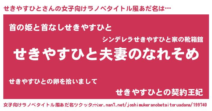 | 男性向けラノベタイトル風あだ名 | 『おまえをオタクにしてやるから、俺をせきやすひとにしてくれ! 』 |