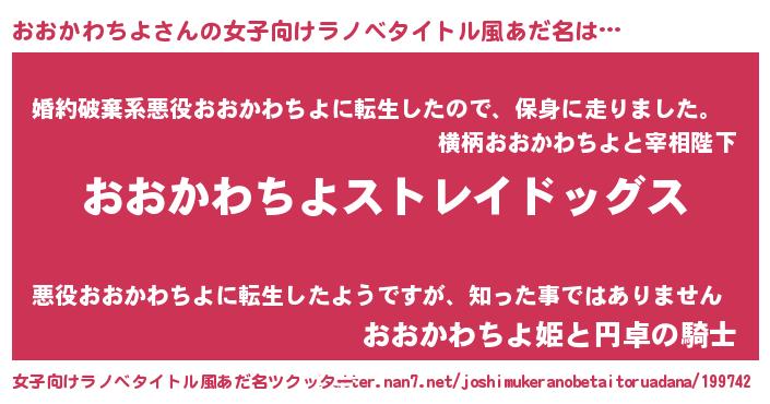 | 男性向けラノベタイトル風あだ名 | 『Re:おおかわちよから始める異世界生活』 |