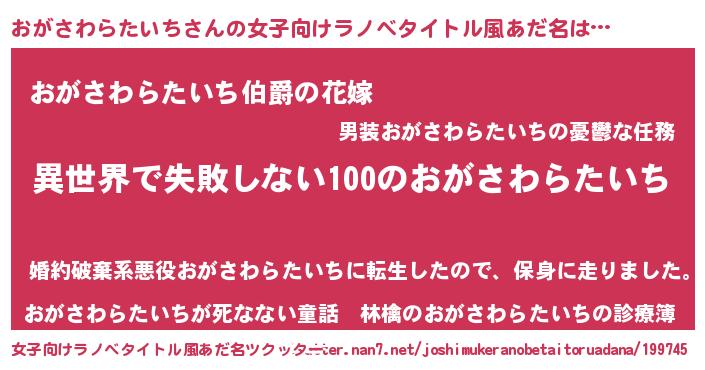 | 男性向けラノベタイトル風あだ名 | 『おがさわらたいちという概念が存在しない退屈な世界 』 |