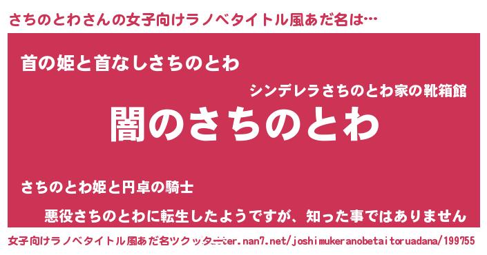 | 男性向けラノベタイトル風あだ名 | 『Re:さちのとわから始める異世界生活』 |