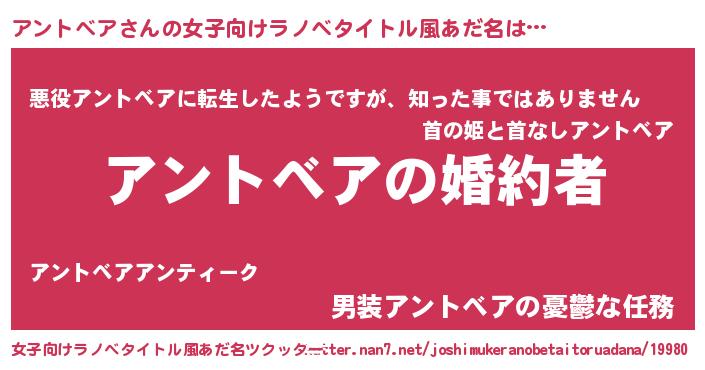 アントベアさんの女子向けラノベタイトル風あだ名は… 『アントベアの婚約者』『悪役アントベアに転生したようですが、知った事ではありません』『男装アントベアの憂鬱な任務』 ツクッター #女子向けラノベタイトル風あだ名ツクッター http://tkutter.nan7.net/joshimukeranobetaitoruadana/19980/