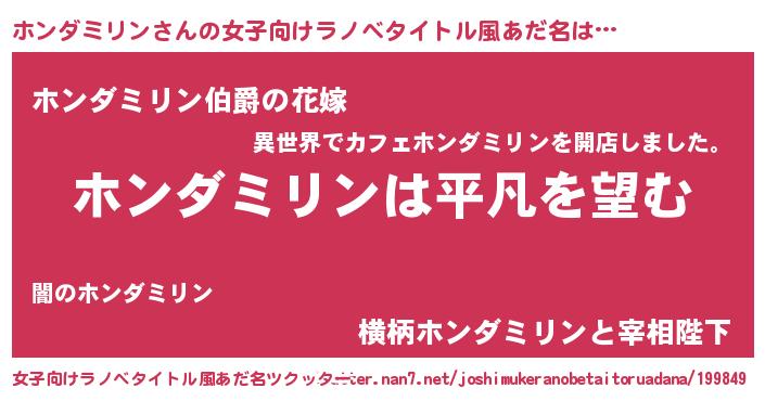 | 男性向けラノベタイトル風あだ名 | 『ダンジョンにホンダミリンを求めるのは間違っているだろうか』 |