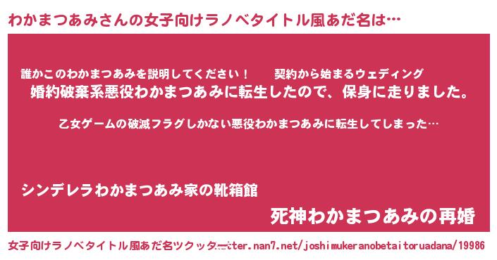 | 男性向けラノベタイトル風あだ名 | 『この素晴らしい世界にわかまつあみを!』 |