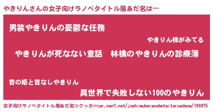 | 男性向けラノベタイトル風あだ名 | 『魔弾の王とやきりん』 |