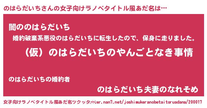 | 男性向けラノベタイトル風あだ名 | 『のはらだいちの憂鬱』 |