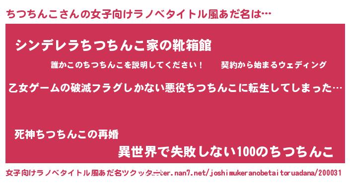| 男性向けラノベタイトル風あだ名 | 『この素晴らしい世界にちつちんこを!』 |