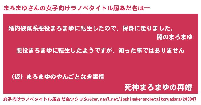 | 男性向けラノベタイトル風あだ名 | 『この素晴らしい世界にまろまゆを!』 |