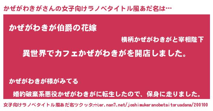 | 男性向けラノベタイトル風あだ名 | 『誰もが恐れるあのかぜがわきがが、ぼくの専属メイドになるようです。』 |